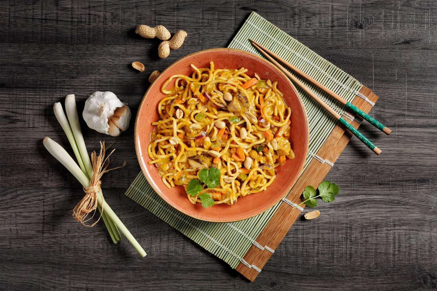 Der Klassiker aus der fernöstlichen Kulinarik überzeugt mit herzhaften Asia-Nudeln, die wir mit knackigem Wok-Gemüse – Karotten, Gemüsepaprika, Bambussprossen und roten Zwiebelstreifen – angebraten haben. Geröstete Erdnuss-Stückchen und die pikante Erdnuss-Soße nach hauseigener HOFMANNS-Rezeptur definieren das unverwechselbare Aroma dieses Premium-Tiefkühlgerichts, das wir zusätzlich mit einem Hauch Ingwer abgeschmeckt haben.