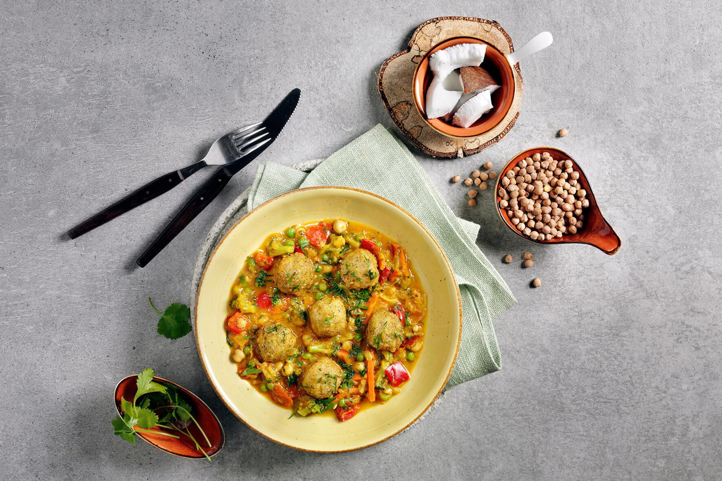 Gemüse in veränderlichen Gewichtsanteilen (49%) (Gemüsepaprika, Zwiebeln, Broccoli, Erbsen, Karotten, Mungobohnenkeimlinge, Kichererbsen), Kokosnussmilch (Kokosnussextrakt, Wasser), Falafelbällchen (21%) (Kichererbsen, WEIZENBULGUR, Wasser, Rapsöl, Zwiebeln, Paniermehl (WEIZENMEHL, Wasser, Speisesalz, Hefe), Maisstärke, jodiertes Speisesalz (Speisesalz, Kaliumjodat), Erbsenstärke, Gewürze, Kräuter), Tomaten, Tomatensaft, Zuckerrübensirup, Thai-Basilikum, jodiertes Speisesalz (Speisesalz, Kaliumjodat), Gelbe Currypaste (getrocknete rote Chilis, Schalotten, Gewürze, Zitronengras, Speisesalz, Galgant, Kurkuma), Gemüsefond (Wasser, Gewürzextrakte, Tomatenmark, Gewürze, Trockenglucosesirup, Karottenextrakt, Tomatenpulver, Speisesalz, Branntweinessig), Olivenöl, Rapsöl, modifizierte Stärke, Gewürze, Knoblauch, Ingwer, Zitronengras.