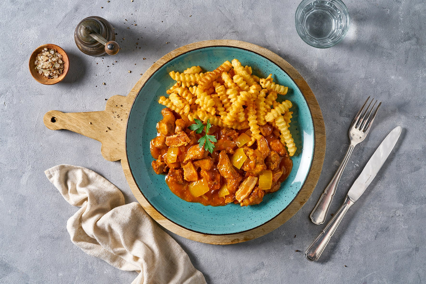 Als Beilage servieren wir krosse Pommes frites, die mit ihrem goldbraunen Crunch das Gericht wunderbar abrunden und für ein köstliches Geschmackserlebnis sorgen.