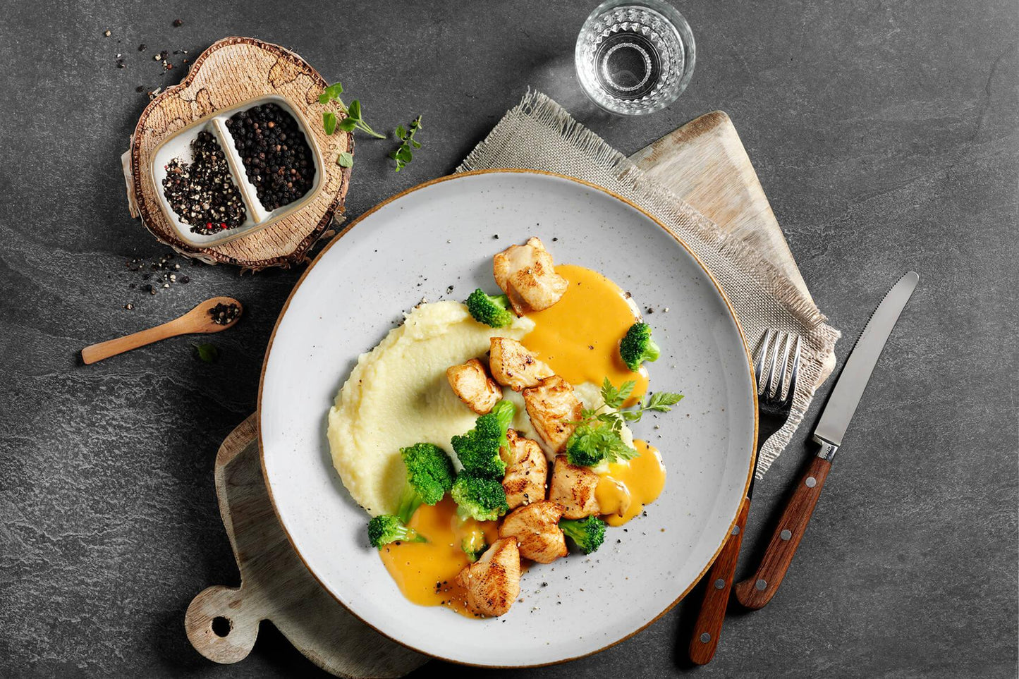 Zarte Hähnchenbrustfiletstücke treffen auf eine köstliche Pfeffer-Käsesoße, die zusammen eine herrliche Kombination mit alpinem Flair ergeben. Als passende Ergänzung haben sich die Spitzenköche bei HOFMANNs für knackige Broccoliröschen und herzhaftes Kartoffelpüree entschieden.