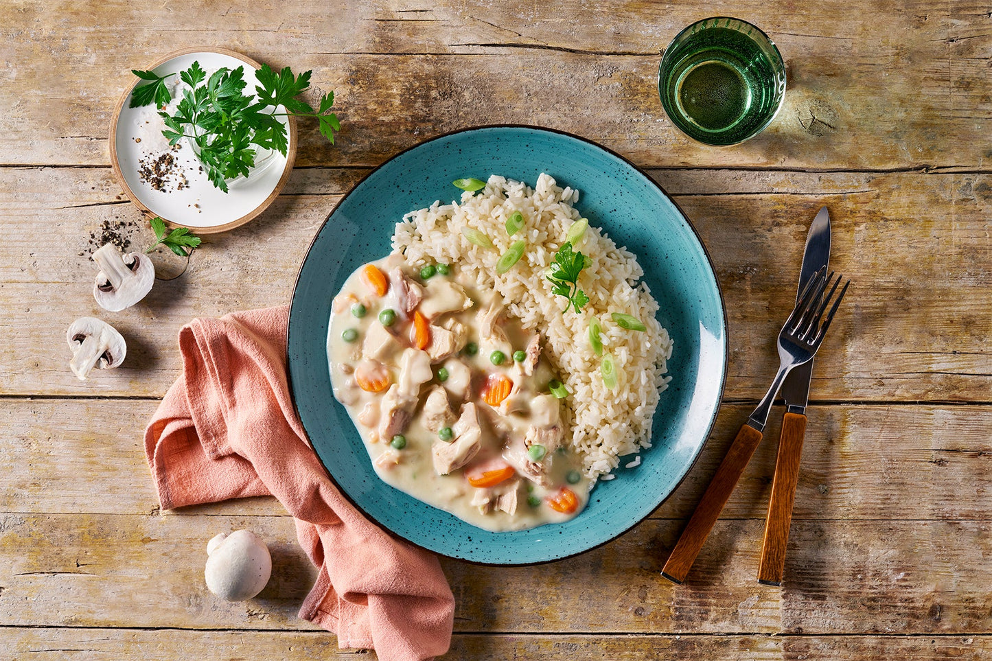 Als perfekte Beilage servieren wir lockeren Langkorn-Reis, der die cremigen Aromen des Frikassees ideal aufnimmt und für einen runden Genuss sorgt.