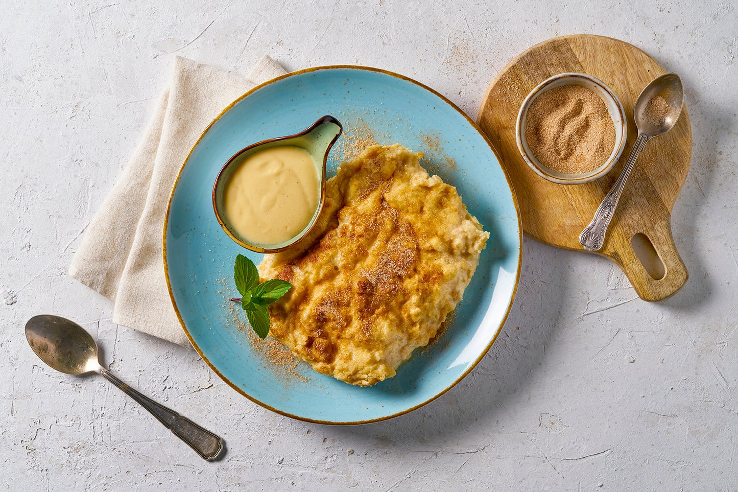 Dazu servieren wir unsere hausgemachte Vanillesoße, die mit ihrem zarten Aroma und ihrer cremigen Konsistenz perfekt zu diesem süßen Auflauf passt.