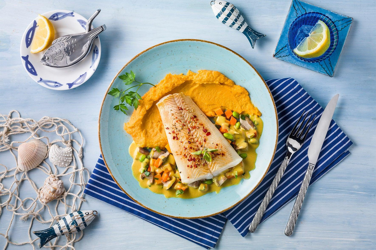 SCHWARZER HEILBUTT (28%), Süßkartoffeln, Gemüse in veränderlichen Gewichtsanteilen (19%) (Kürbis, Shiitakepilze, Karotten, Porree, Edamame (grüne SOJABOHNEN)), Wasser, Rapsöl, Erdnussmus (3%) (geröstete, gemahlene ERDNUSSKERNE), Zwiebeln, Tomaten, Tomatensaft, Zuckerrübensirup, Kartoffelpüreeflocken (Kartoffeln, Emulgator Mono- und Diglyceride von Speisefettsäuren, Curcumaextrakt), jodiertes Speisesalz (Speisesalz, Kaliumjodat), Gemüsefond (Wasser, Gewürzextrakte, Tomatenmark, Gewürze, Trockenglucosesirup, Karottenextrakt, Tomatenpulver, Speisesalz, Branntweinessig), Zitronengras, Curry Madras, Orangensaftkonzentrat, Knoblauch, SESAMÖL, Ingwer, Gewürze, Kräuter.