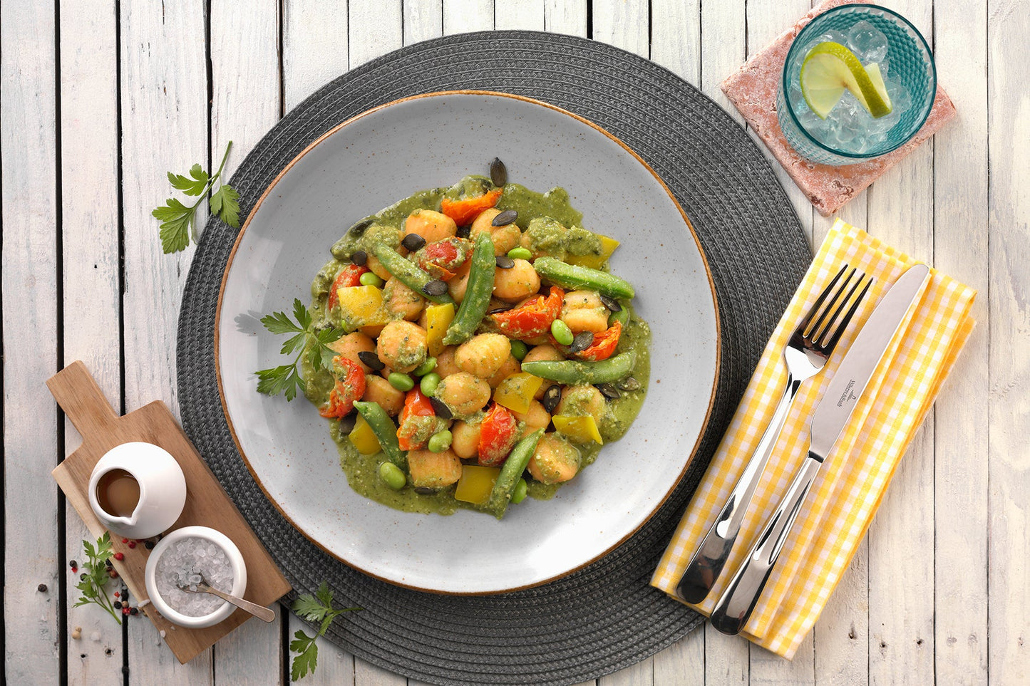 Gnocchi mit Süßkartoffeln (Kartoffeln, Süßkartoffeln (27%), Stärke, Maisgrieß, Rapsöl, Speisesalz, Verdickungsmittel Guarkernmehl, Säuerungsmittel Citronensäure, Curcuma, Curcumaextrakt), Gemüse in veränderlichen Gewichtsanteilen (23%) (Edamame (grüne SOJABOHNEN), Königserbsenschoten, Gemüsepaprika, getrocknete Tomaten), Erbsen passiert (12%), Rapsöl, Zwiebeln, Wasser, Kürbiskerne (3%), Kürbiskernöl (1%), jodiertes Speisesalz (Speisesalz, Kaliumjodat), Kräuter.
